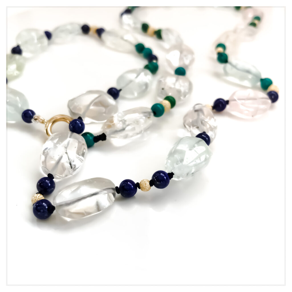 Collane realizzabili con diversi tipi di pietre o perle, in varie lunghezze con inserti e dettagli personalizzabili, in oro ed in argento.